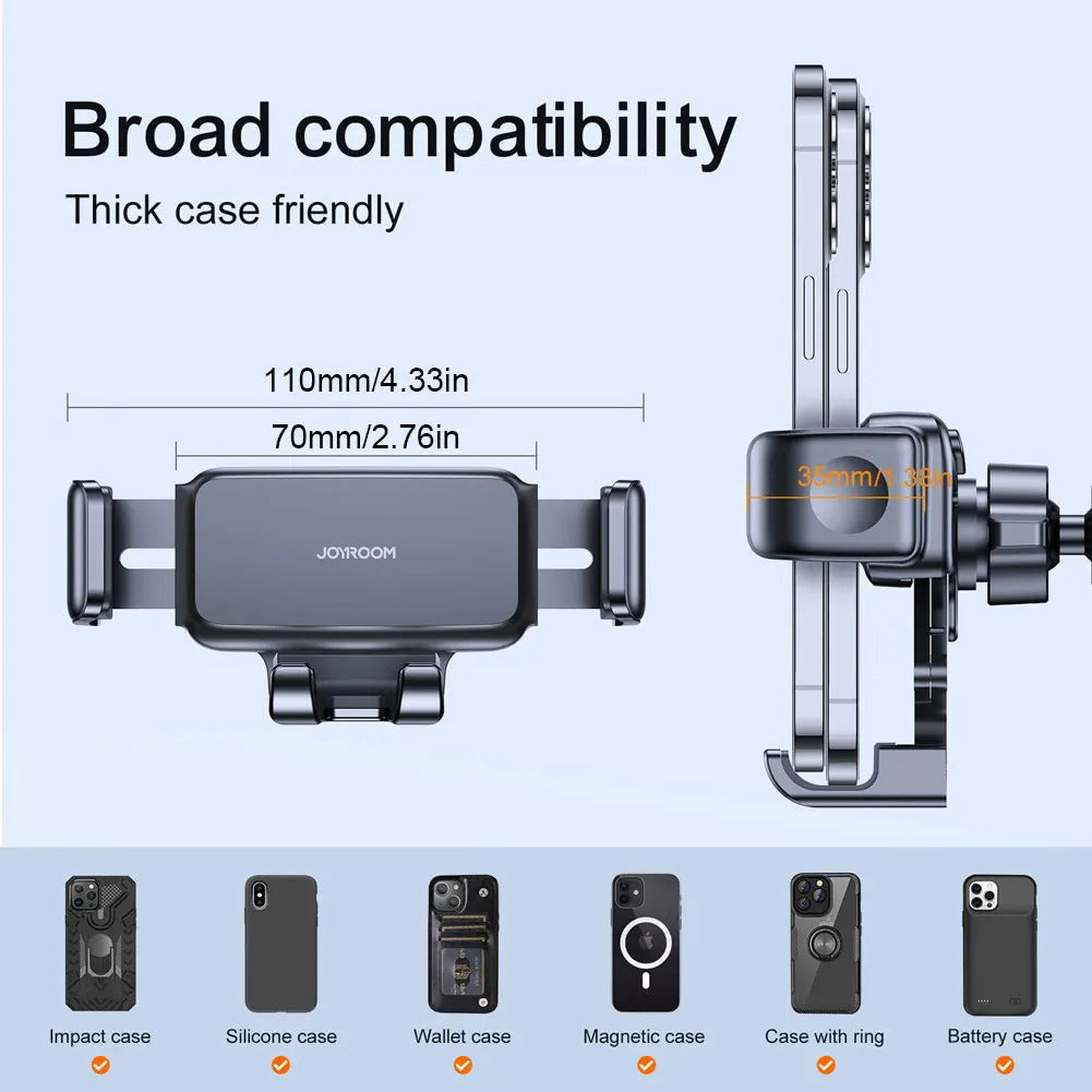 Su diseño ajustable permite sujetar teléfonos de 4,5 a 6,8 pulgadas, manteniéndolos estables incluso en caminos irregulares. Además, es fácil de instalar y desmontar sin necesidad de herramientas.